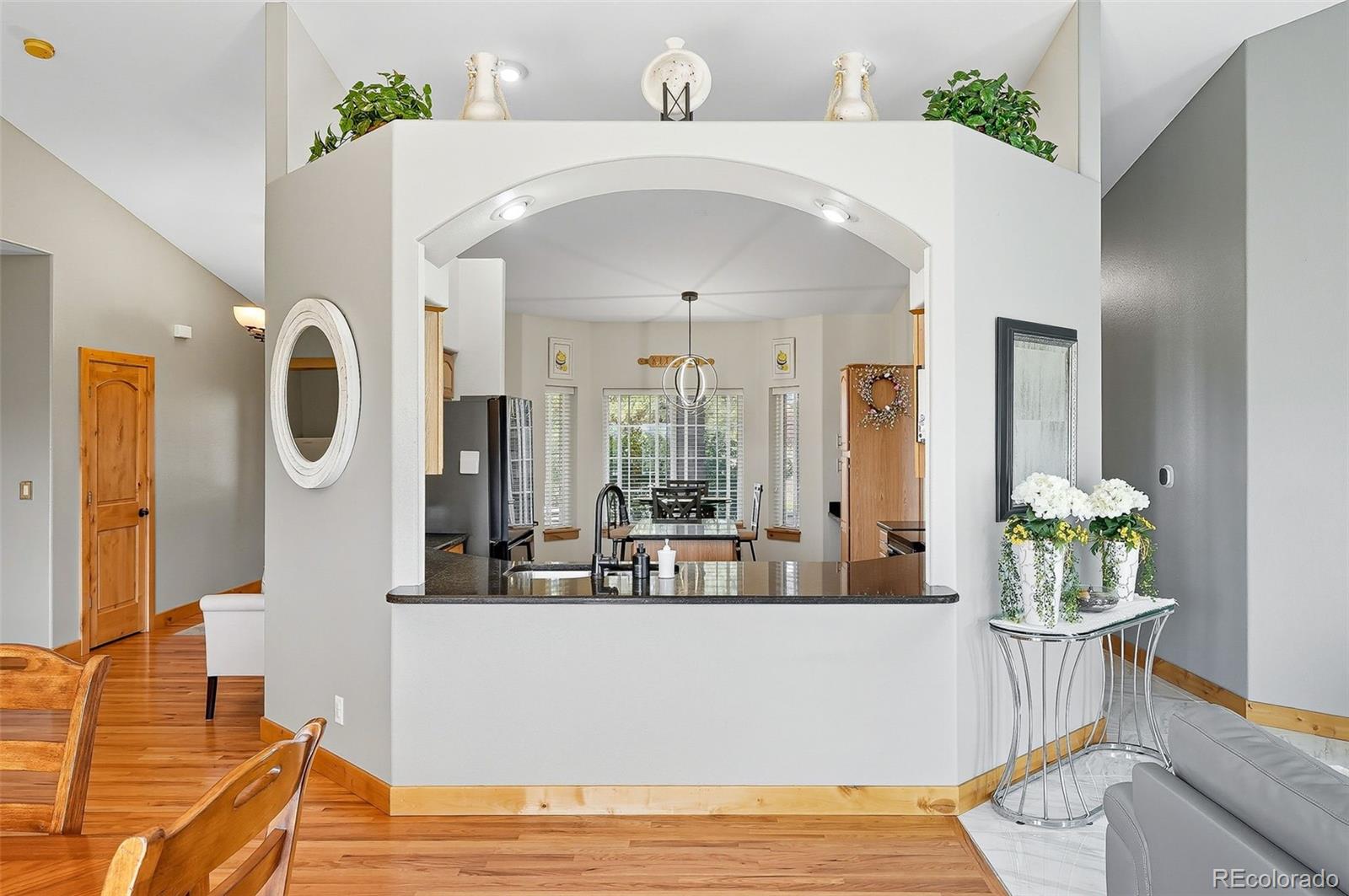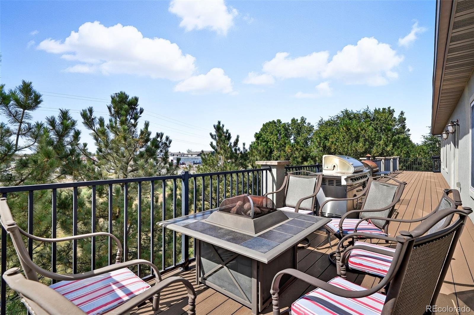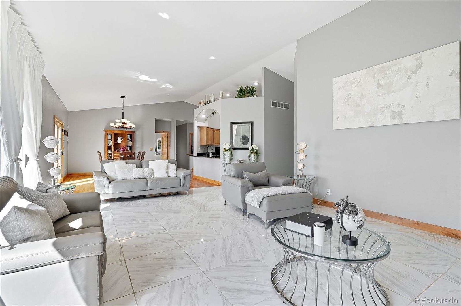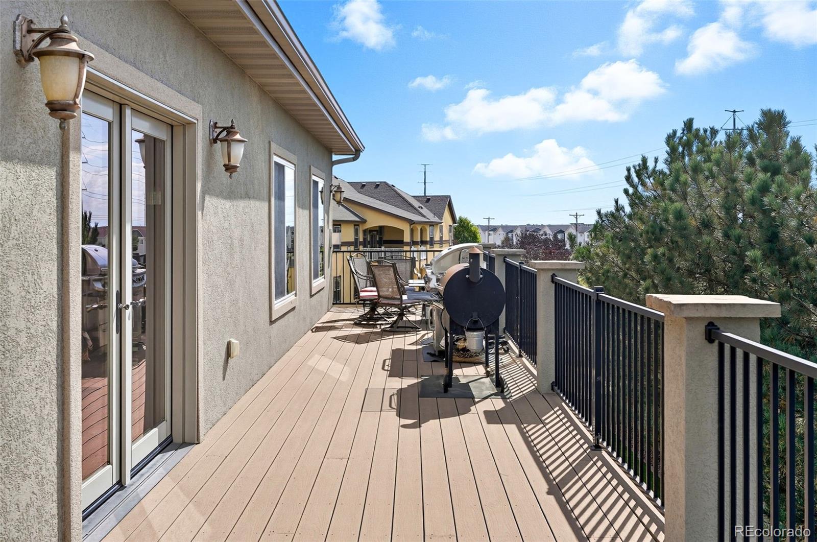 Wrapped in mature, thoughtfully designed landscaping unmatched in Fort Lupton, this property feels like a private retreat. Towering trees provide year-round color and privacy, while a grandfathered retaining wall lifts the lot six feet above its neighbors. Behind it, mature evergreens form a lush backdrop and the expansive yard features professionally maintained turf. The result is a setting with sweeping mountain views and a sense of seclusion rarely found in town. Inside, an open floor plan with high ceilings and custom oak doors accented by rich wood trim highlights quality craftsmanship. The kitchen was recently painted and updated with new appliances in the past year. The light-filled living room leads to a huge deck, perfect for taking in mountain views and sunsets. The large main-level primary suite offers plenty of space for a king size bed, a five-piece bath with a soaking tub and dual vanities, plus a large walk-in closet with a fully custom Container Store design. Two additional generous sized bedrooms and baths provide space for guests, kids, or a home office. The laundry/mud room connects to the oversized three-car garage with the option for electric car charging. The walkout basement includes a second kitchen with granite bar, refrigerator, sink, and dishwasher, plus generous recreation space, two more bedrooms, and a full bath--ideal for an in-law suite. The basement opens to a covered patio and yard designed for entertaining or play. Two furnaces, two AC units, and two water heaters ensure year-round comfort. Recent updates include a new roof with upgraded shingles, three new garage doors, new gutters with discreet under-mount drainage, and a one-year-old washer and dryer. This is a rare opportunity to own a home where extraordinary landscaping meets panoramic mountain views.