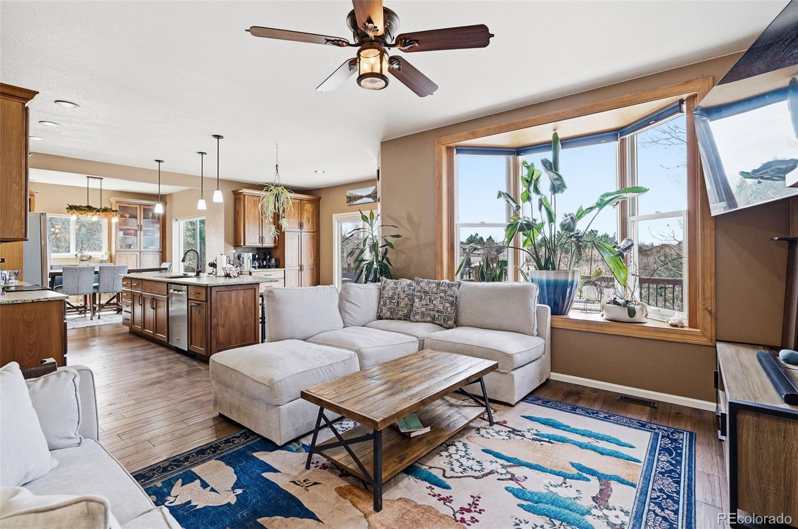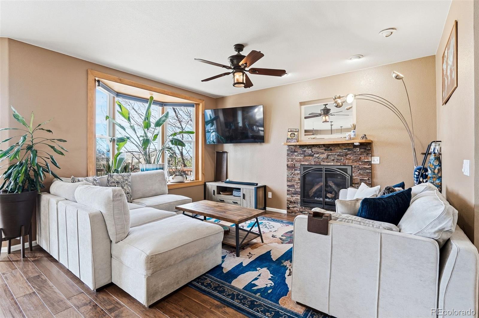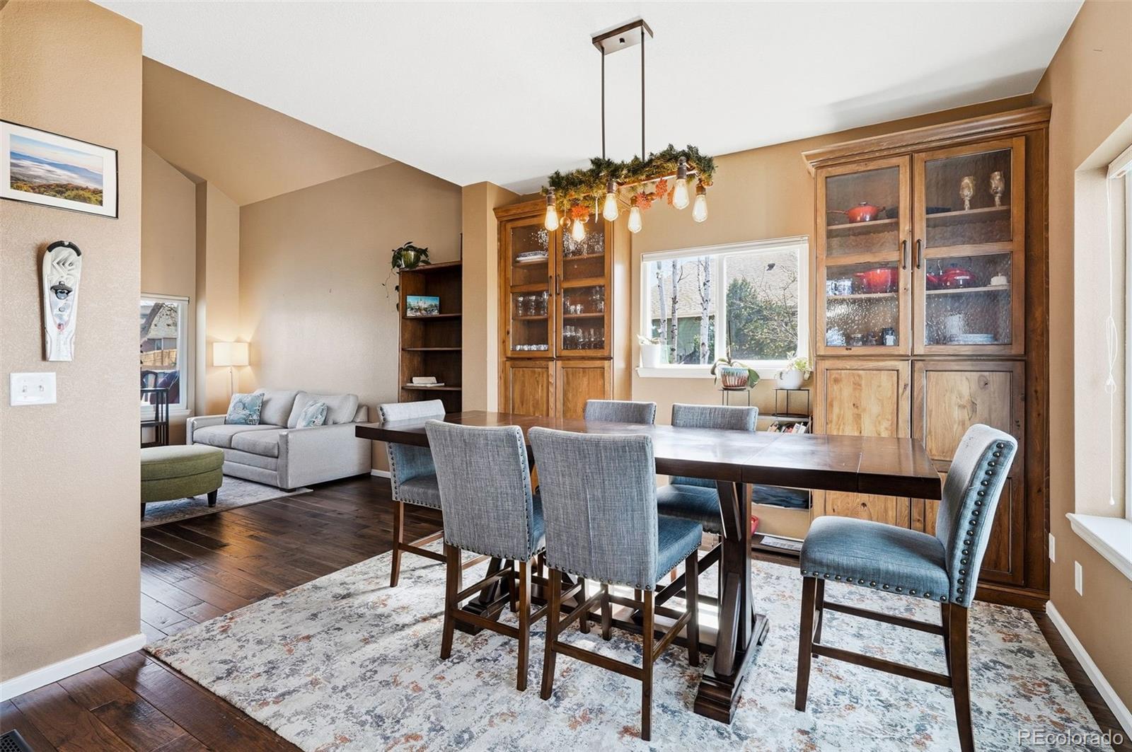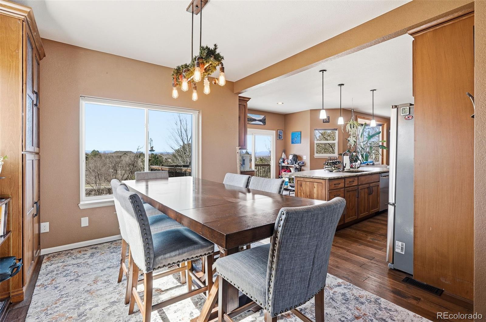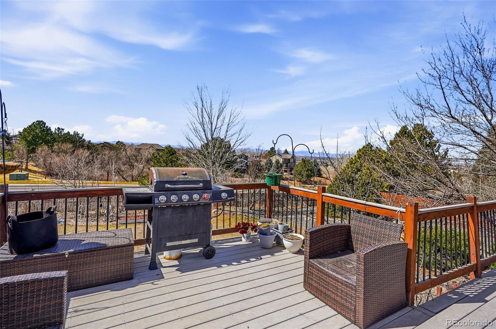 Mountain views, a functional layout, and meaningful updates throughout come together in this 3-bedroom, 4-bathroom home in Parker. From the moment you walk in, you're greeted by a two story entry, sweeping staircase, and recently refinished hardwood floors, with natural light filling the main level. The kitchen is set up for both everyday use and entertaining with Beechwood cabinetry, leathered granite countertops, an inset Blanco sink, stainless steel appliances, and a large center island. It opens directly to the living space with a fireplace, creating a comfortable and connected layout, along with a formal dining area for larger gatherings. Upstairs, the primary suite includes its own fireplace, a sitting area with mountain views, and a newly remodeled bathroom featuring dual vanities, a soaking tub, a separate shower, and a walk-in closet. Two additional bedrooms and a full bathroom complete the upper level. A finished walkout basement adds flexibility with a large recreation space, wet bar, additional bathroom, and room for a gym, office, or guest setup. Recent improvements include new flooring, fresh exterior and interior paint, updated lighting, added attic insulation, a new furnace installed within the last four years and a new dishwasher. The garage is equipped with a 240V outlet for EV charging. The backyard offers a true retreat with mature apple and pear trees, a massive deck with incredible views and an included hot tub and sauna. Located near Black Bear Golf Club, parks, trails, and neighborhood amenities with convenient access to major roads, this home offers a combination of updates, space, and views in a well established Parker community.