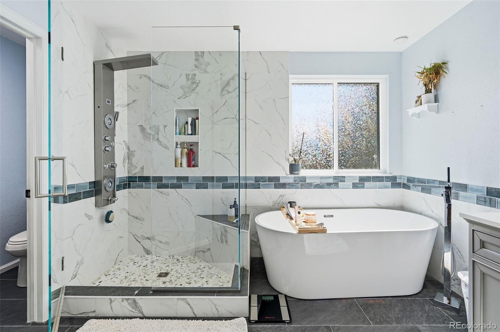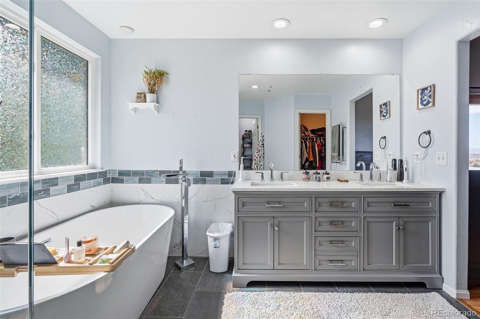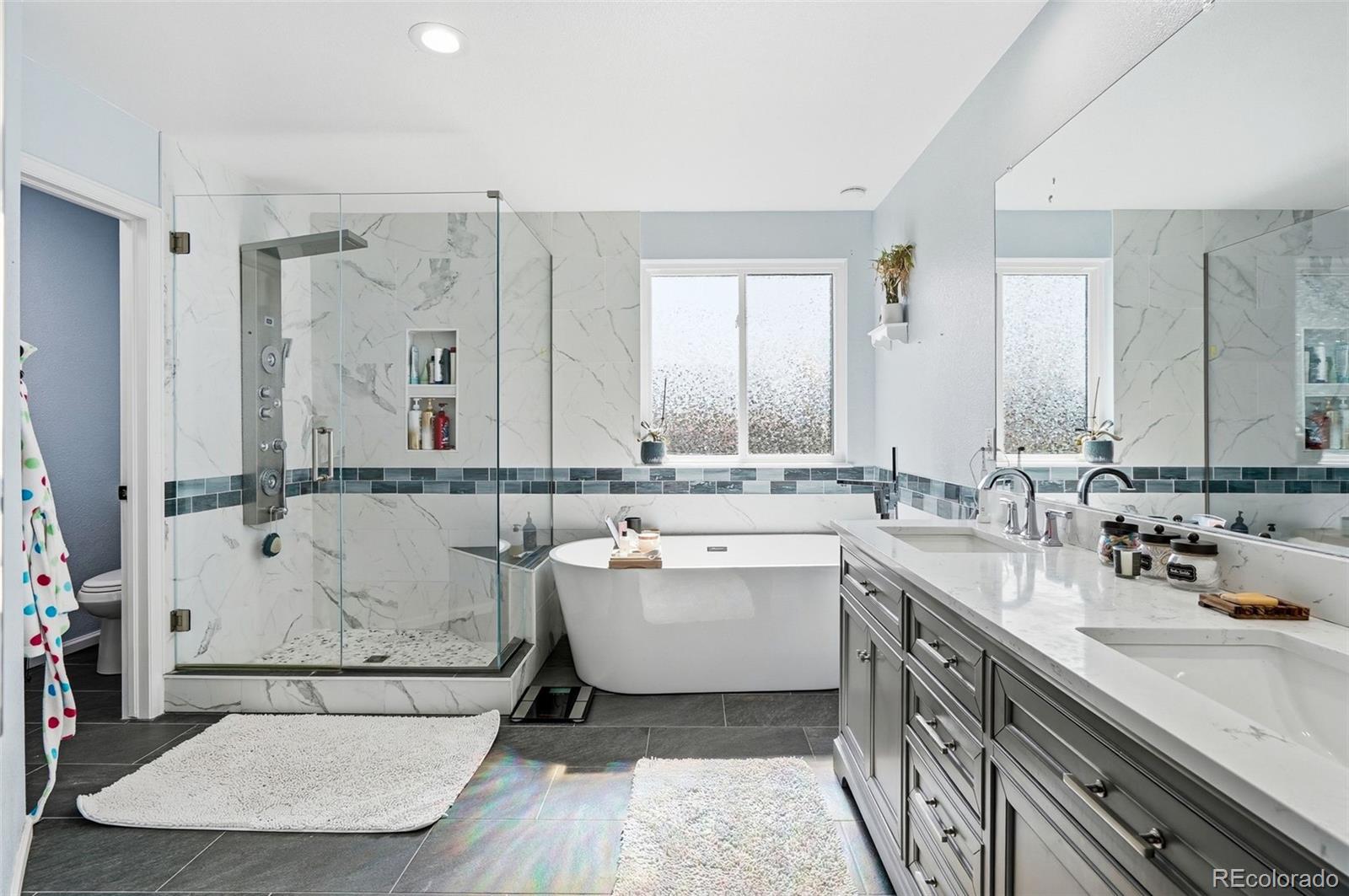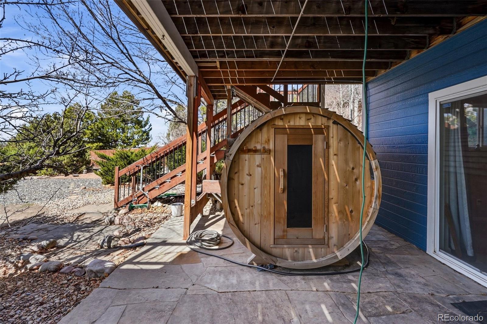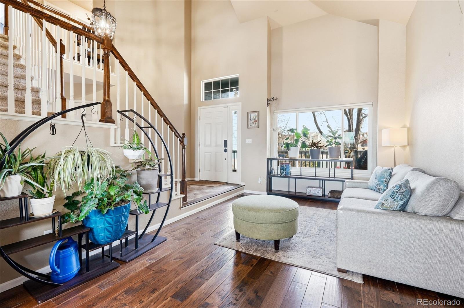 Mountain views, a functional layout, and meaningful updates throughout come together in this 3-bedroom, 4-bathroom home in Parker. From the moment you walk in, you're greeted by a two story entry, sweeping staircase, and recently refinished hardwood floors, with natural light filling the main level. The kitchen is set up for both everyday use and entertaining with Beechwood cabinetry, leathered granite countertops, an inset Blanco sink, stainless steel appliances, and a large center island. It opens directly to the living space with a fireplace, creating a comfortable and connected layout, along with a formal dining area for larger gatherings. Upstairs, the primary suite includes its own fireplace, a sitting area with mountain views, and a newly remodeled bathroom featuring dual vanities, a soaking tub, a separate shower, and a walk-in closet. Two additional bedrooms and a full bathroom complete the upper level. A finished walkout basement adds flexibility with a large recreation space, wet bar, additional bathroom, and room for a gym, office, or guest setup. Recent improvements include new flooring, fresh exterior and interior paint, updated lighting, added attic insulation, a new furnace installed within the last four years and a new dishwasher. The garage is equipped with a 240V outlet for EV charging. The backyard offers a true retreat with mature apple and pear trees, a massive deck with incredible views and an included hot tub and sauna. Located near Black Bear Golf Club, parks, trails, and neighborhood amenities with convenient access to major roads, this home offers a combination of updates, space, and views in a well established Parker community.