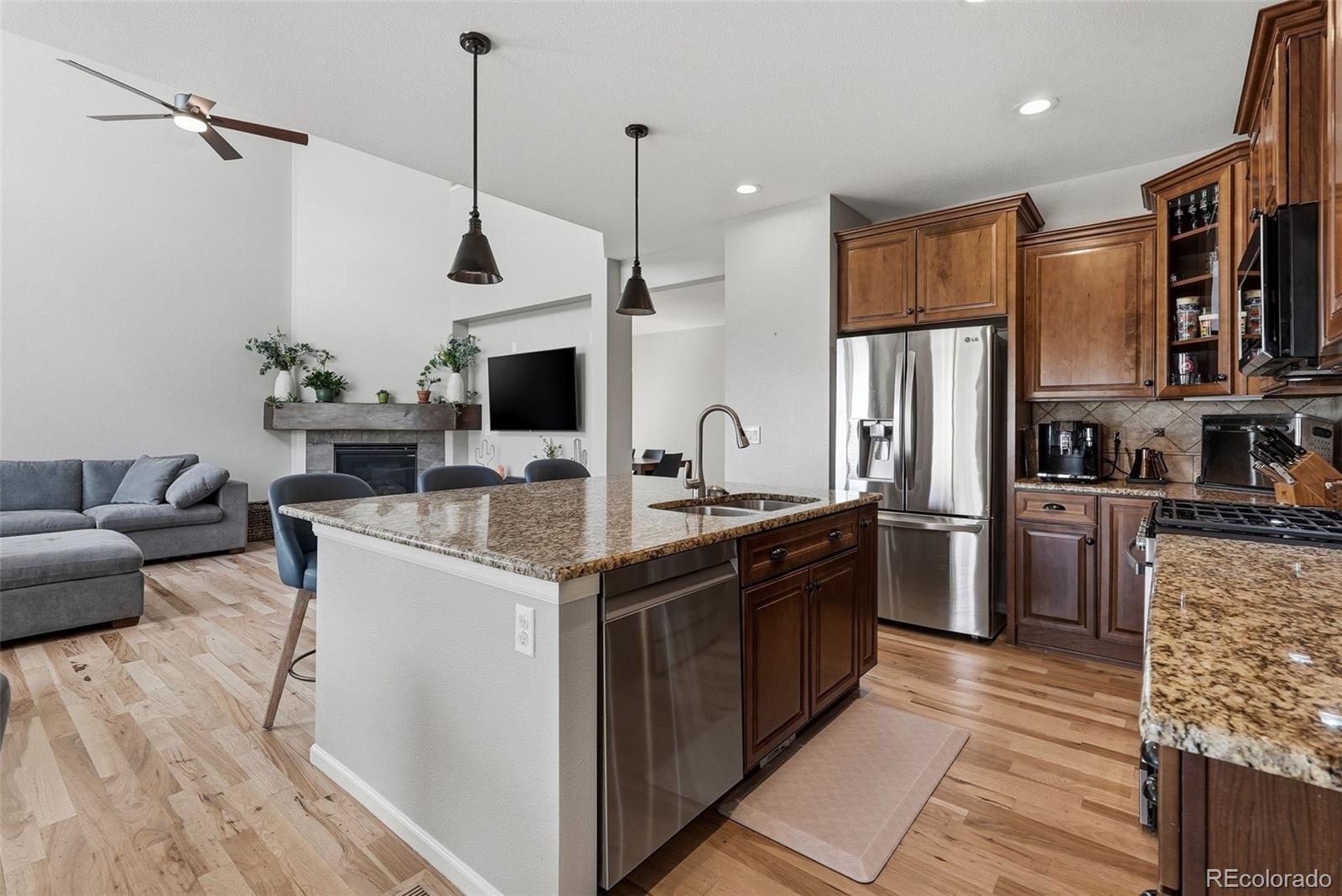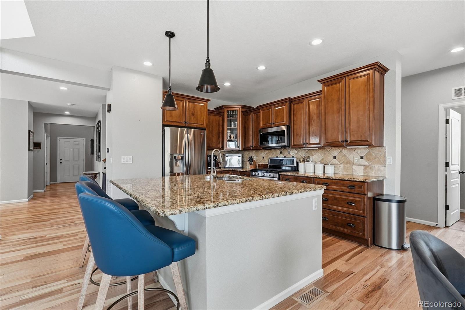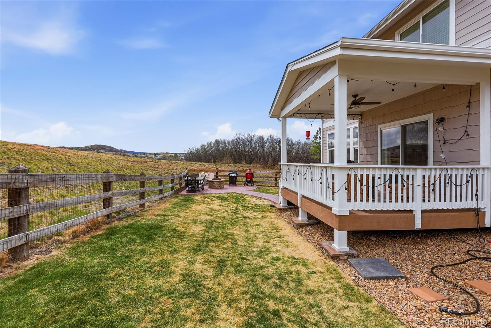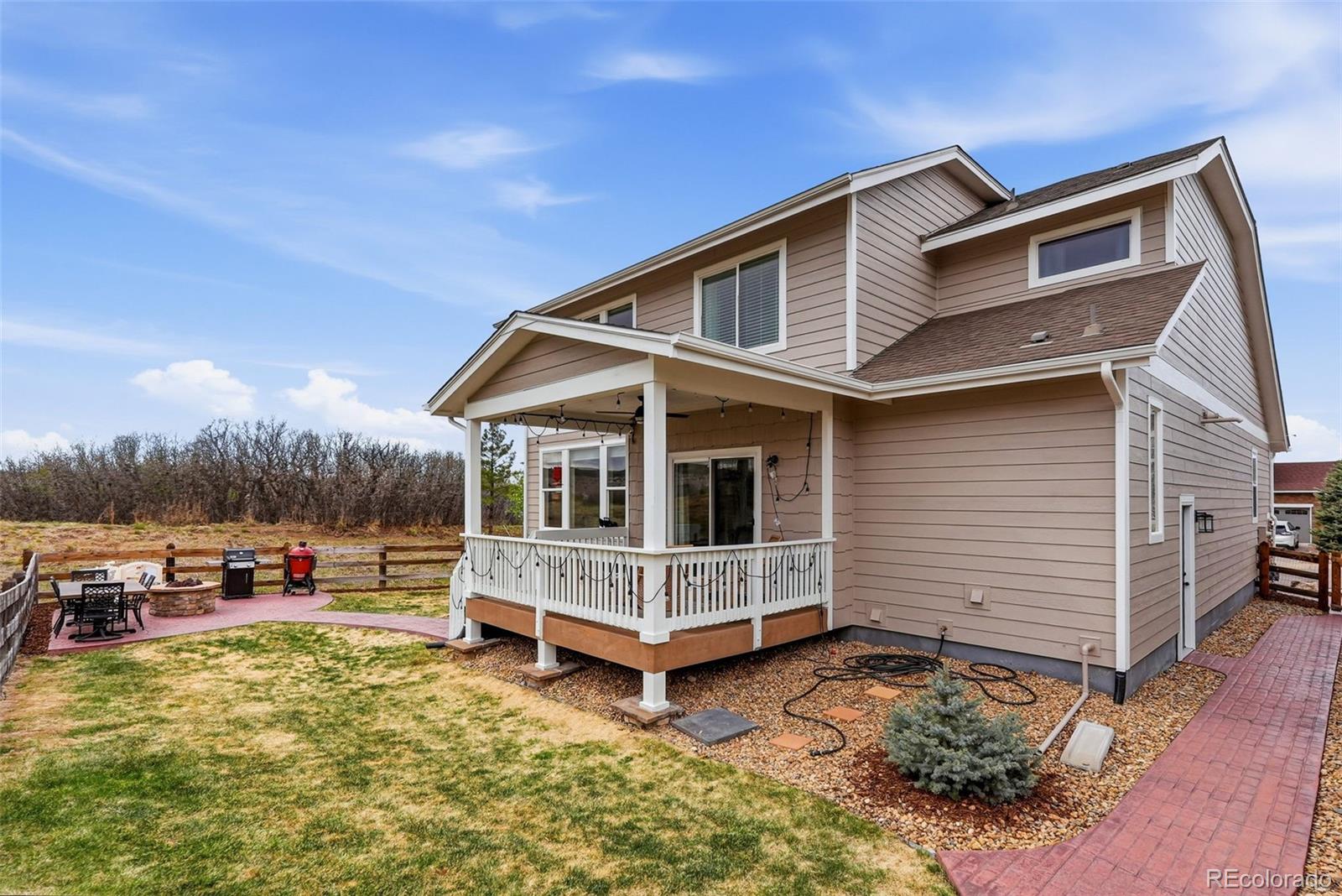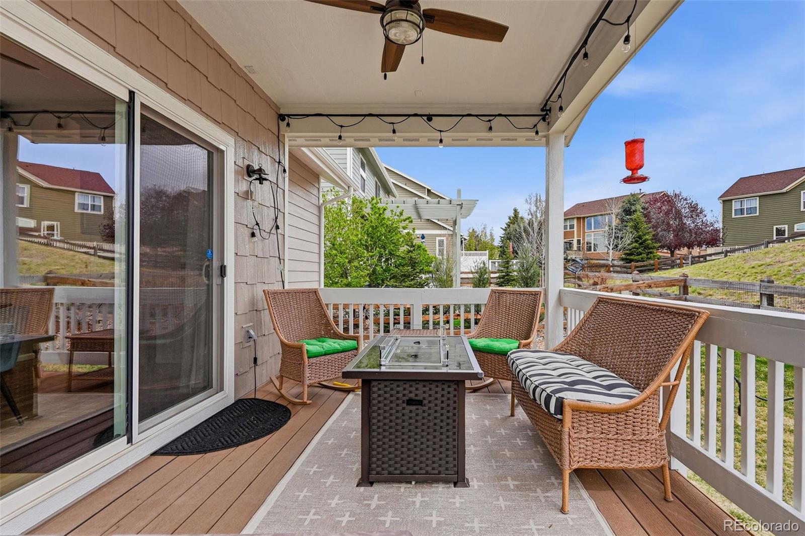 Positioned on a corner lot backing to open space, this home offers a rare combination of privacy, views, and direct access to trails, parks, and community amenities in The Meadows. Just a short walk to the neighborhood pool and playground, the location makes everyday living easy. As you enter, you'll notice newly refinished hardwood floors throughout the main level and fresh interior paint, creating a clean and updated feel. The main level includes a private office with a closet, offering flexibility for a true fifth bedroom or a work-from-home setup. High ceilings and open living areas connect seamlessly to the kitchen and dining space. The kitchen features stainless steel appliances, ample storage, and an easy flow to the outdoor space. Out back, you'll find a private deck with a firepit and usable yard space. Upstairs, the primary suite offers a spacious retreat with a large bedroom, five-piece bathroom, and generous closet space. Additional bedrooms provide flexibility for guests, family, or workspace. The finished basement adds valuable square footage with a built-out bar area and dedicated workout space, making it ideal for entertaining or everyday use. Recent updates include interior and exterior paint, refinished hardwood floors, new blinds, updated lighting and ceiling fans, along with key maintenance items such as duct cleaning, a water softener with carbon filter, water pressure valve, new garbage disposal, and a replaced garage door panel. A well-maintained home with meaningful updates, functional living spaces, and a location that connects directly to everything The Meadows has to offer.