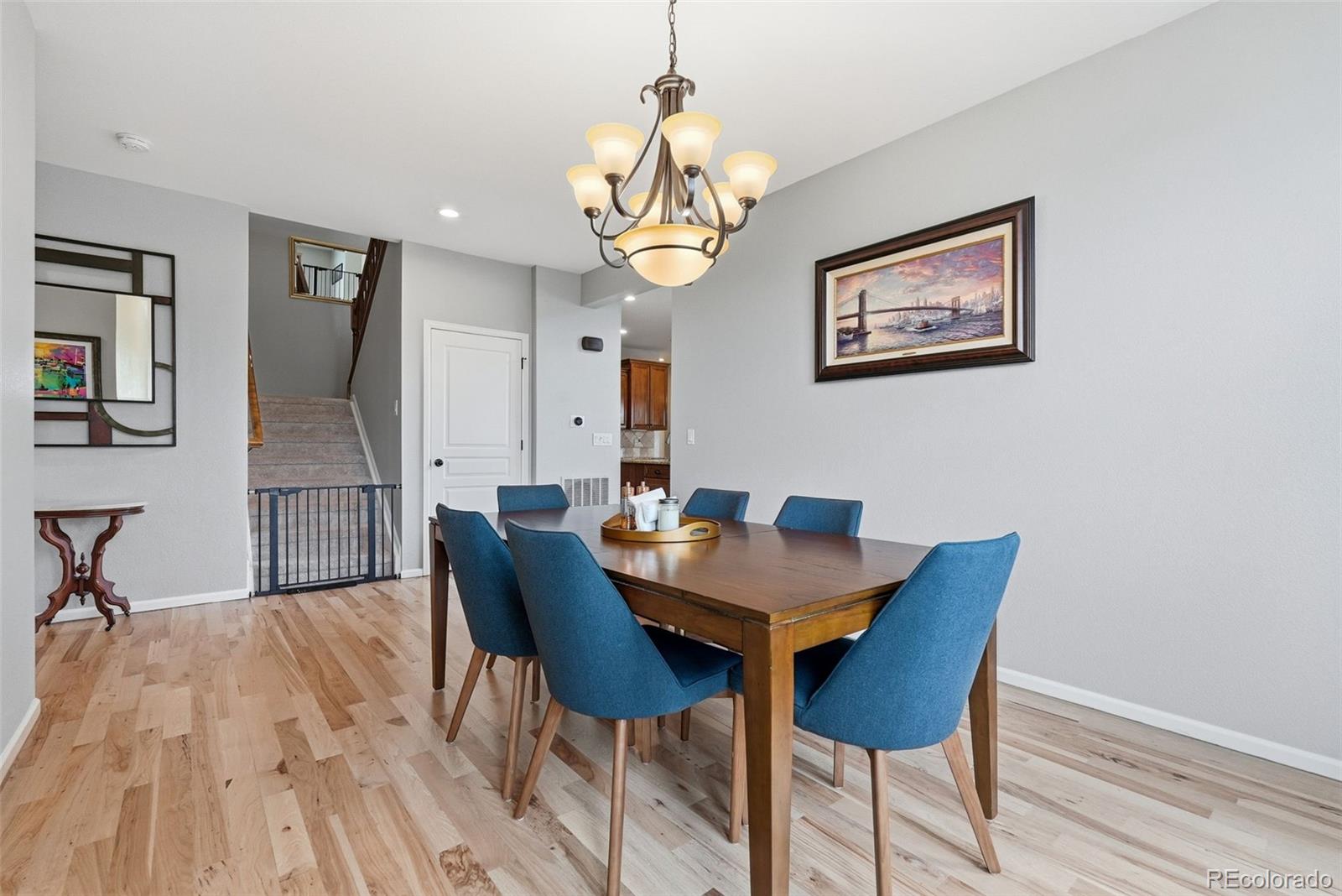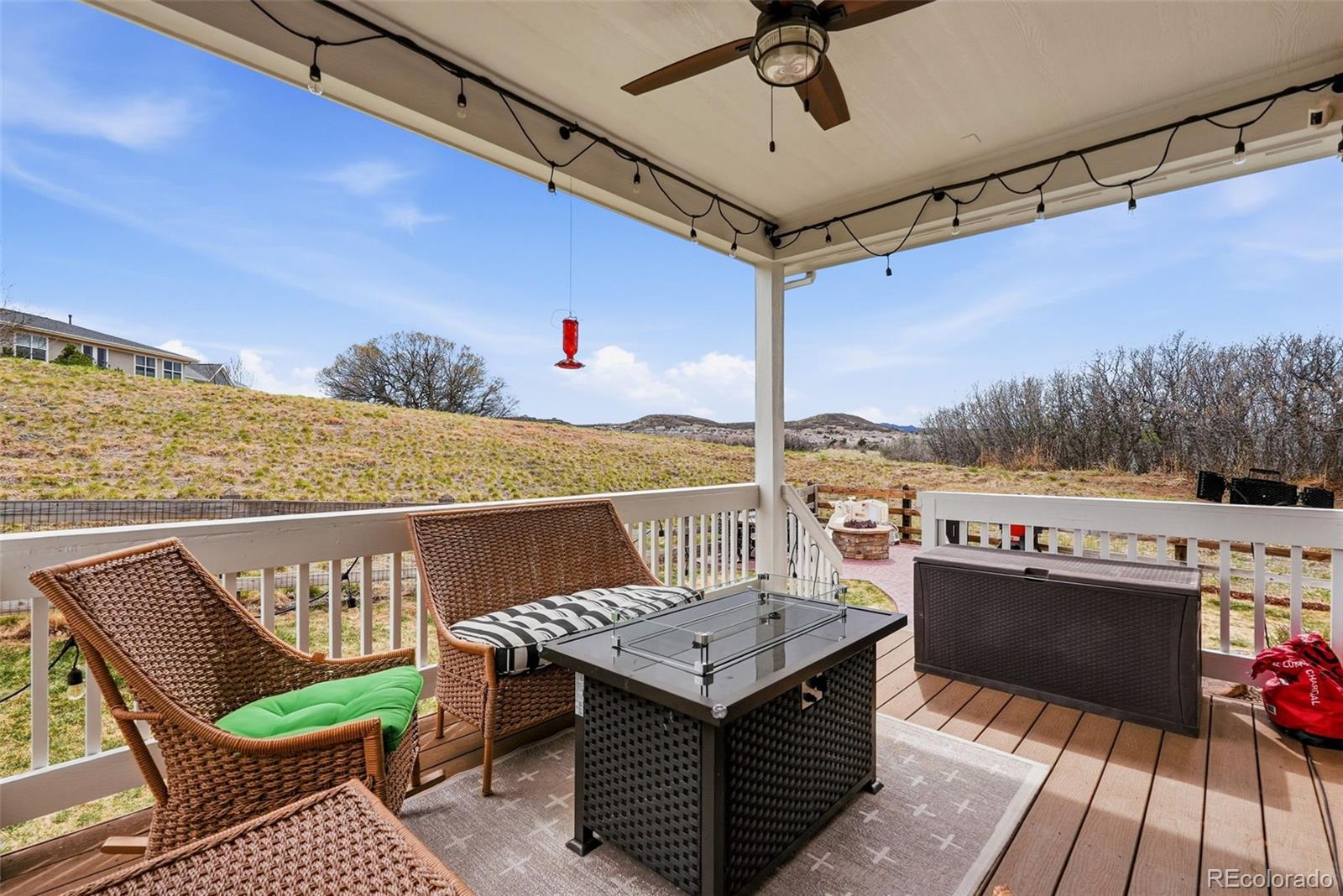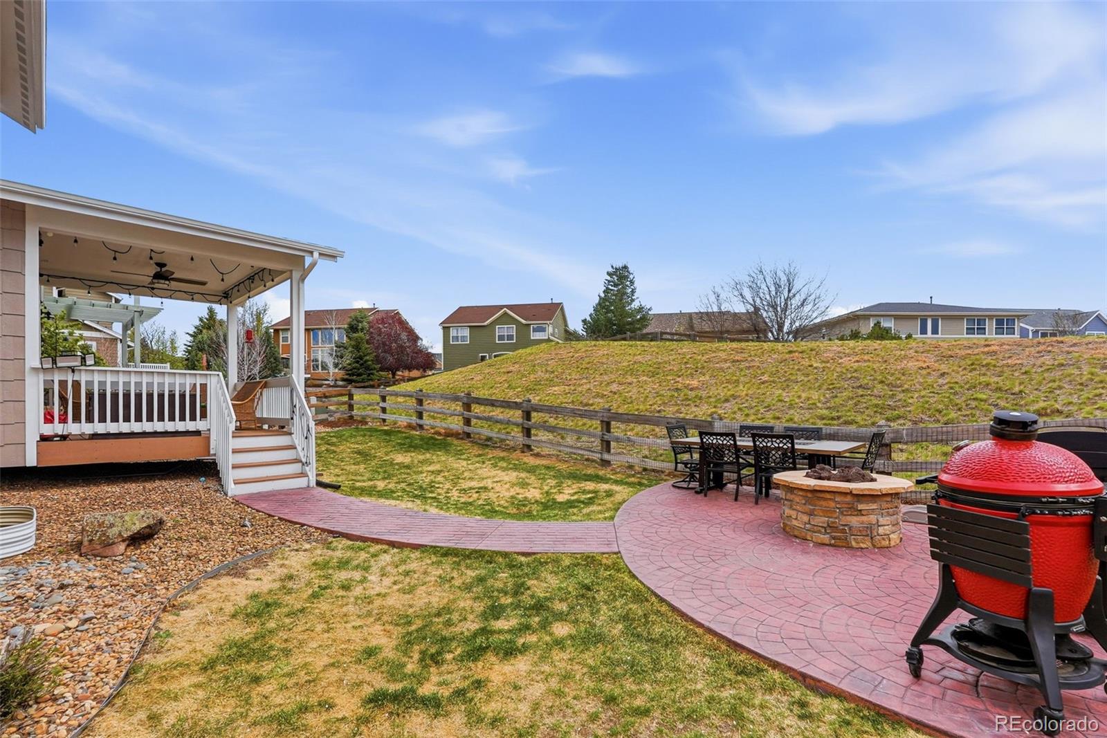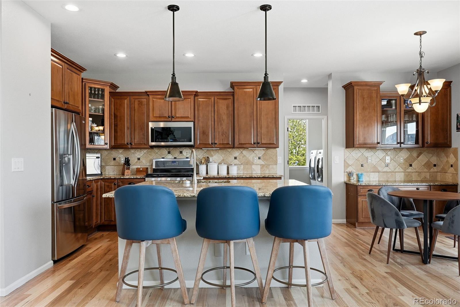 Positioned on a corner lot backing to open space, this home offers a rare combination of privacy, views, and direct access to trails, parks, and community amenities in The Meadows. Just a short walk to the neighborhood pool and playground, the location makes everyday living easy. As you enter, you'll notice newly refinished hardwood floors throughout the main level and fresh interior paint, creating a clean and updated feel. The main level includes a private office with a closet, offering flexibility for a true fifth bedroom or a work-from-home setup. High ceilings and open living areas connect seamlessly to the kitchen and dining space. The kitchen features stainless steel appliances, ample storage, and an easy flow to the outdoor space. Out back, you'll find a private deck with a firepit and usable yard space. Upstairs, the primary suite offers a spacious retreat with a large bedroom, five-piece bathroom, and generous closet space. Additional bedrooms provide flexibility for guests, family, or workspace. The finished basement adds valuable square footage with a built-out bar area and dedicated workout space, making it ideal for entertaining or everyday use. Recent updates include interior and exterior paint, refinished hardwood floors, new blinds, updated lighting and ceiling fans, along with key maintenance items such as duct cleaning, a water softener with carbon filter, water pressure valve, new garbage disposal, and a replaced garage door panel. A well-maintained home with meaningful updates, functional living spaces, and a location that connects directly to everything The Meadows has to offer.