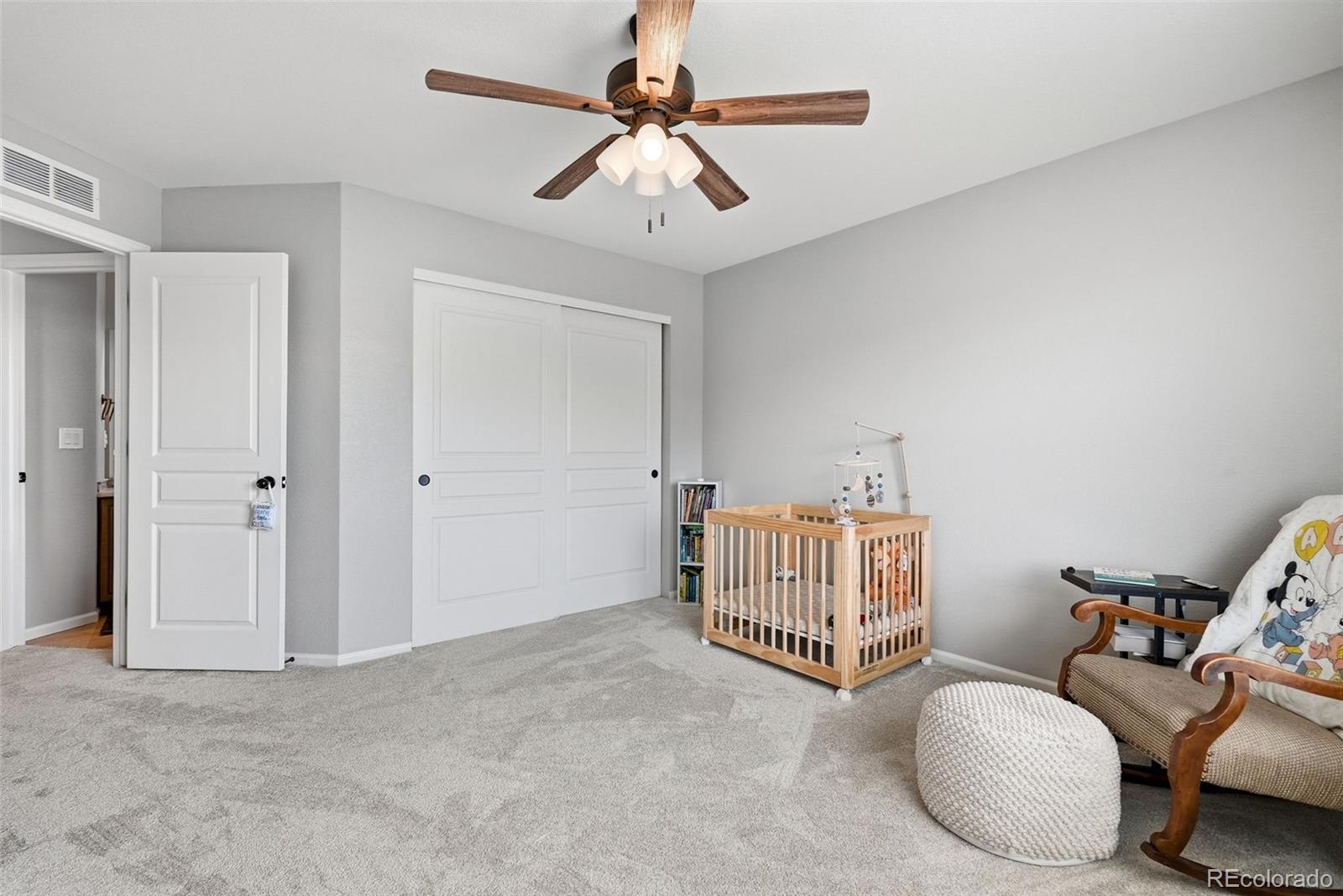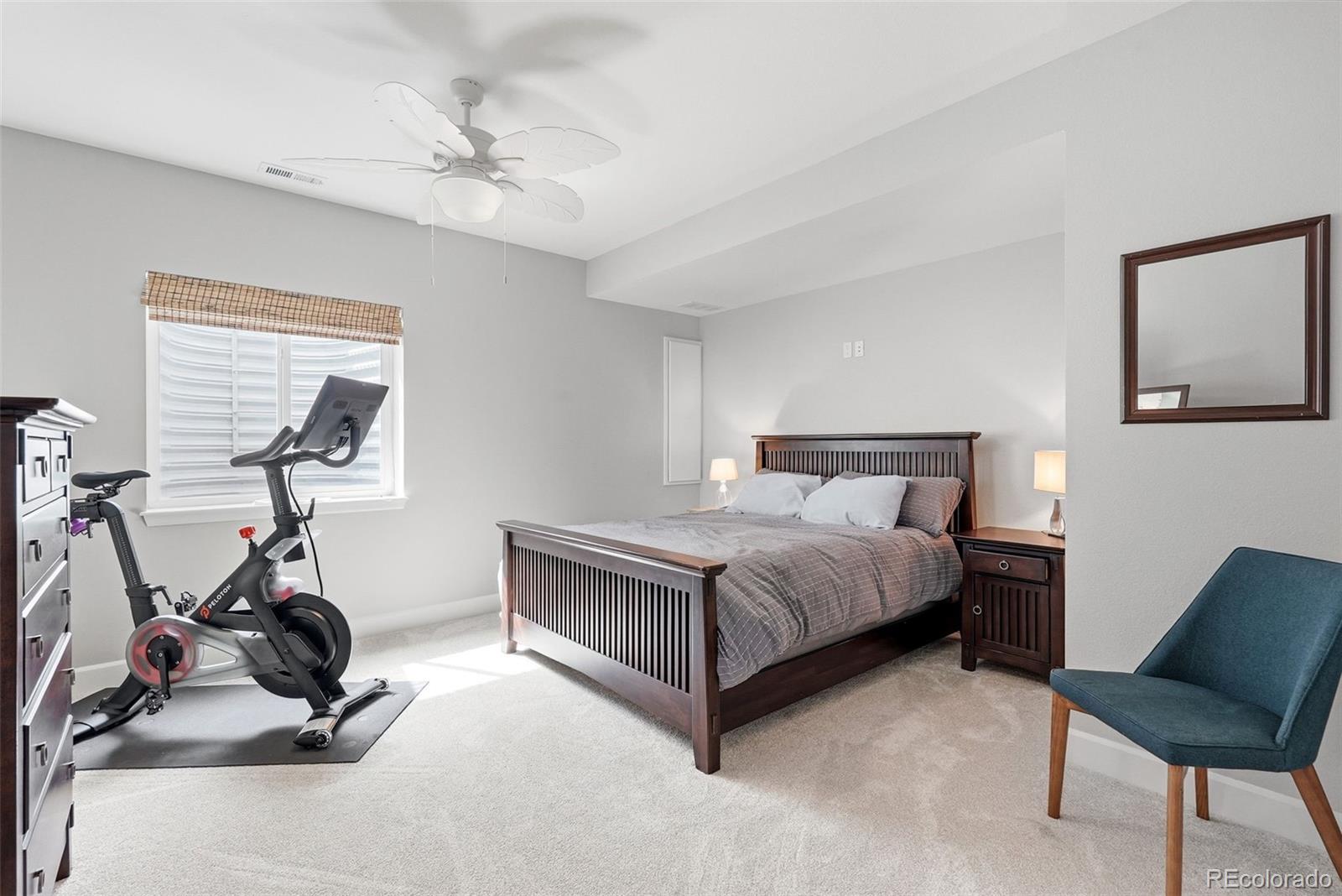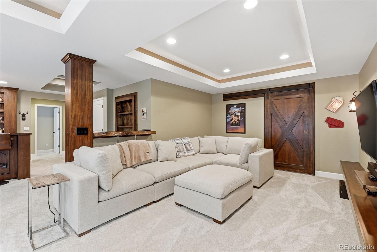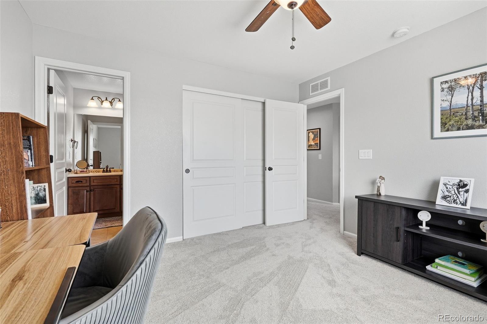 Positioned on a corner lot backing to open space, this home offers a rare combination of privacy, views, and direct access to trails, parks, and community amenities in The Meadows. Just a short walk to the neighborhood pool and playground, the location makes everyday living easy. As you enter, you'll notice newly refinished hardwood floors throughout the main level and fresh interior paint, creating a clean and updated feel. The main level includes a private office with a closet, offering flexibility for a true fifth bedroom or a work-from-home setup. High ceilings and open living areas connect seamlessly to the kitchen and dining space. The kitchen features stainless steel appliances, ample storage, and an easy flow to the outdoor space. Out back, you'll find a private deck with a firepit and usable yard space. Upstairs, the primary suite offers a spacious retreat with a large bedroom, five-piece bathroom, and generous closet space. Additional bedrooms provide flexibility for guests, family, or workspace. The finished basement adds valuable square footage with a built-out bar area and dedicated workout space, making it ideal for entertaining or everyday use. Recent updates include interior and exterior paint, refinished hardwood floors, new blinds, updated lighting and ceiling fans, along with key maintenance items such as duct cleaning, a water softener with carbon filter, water pressure valve, new garbage disposal, and a replaced garage door panel. A well-maintained home with meaningful updates, functional living spaces, and a location that connects directly to everything The Meadows has to offer.